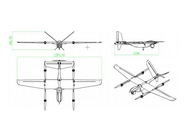 Four-rotor fixed-wing hybrid layout UAV, the maximum take-off weight is 10kg±5%; the fixed-wing part adopts the layout of a single wing with a large aspect ratio, a V-shaped tail, and a rear propeller; the quad-rotor part and the fixed-wing part of the wing Combine. The UAV has both the vertical take-off and landing capability of a quad-rotor aircraft and the fast cruise capability of a fixed-wing aircraft. With four different loads, the corresponding load can be quickly replaced according to mission requirements, and it has broad application prospects.